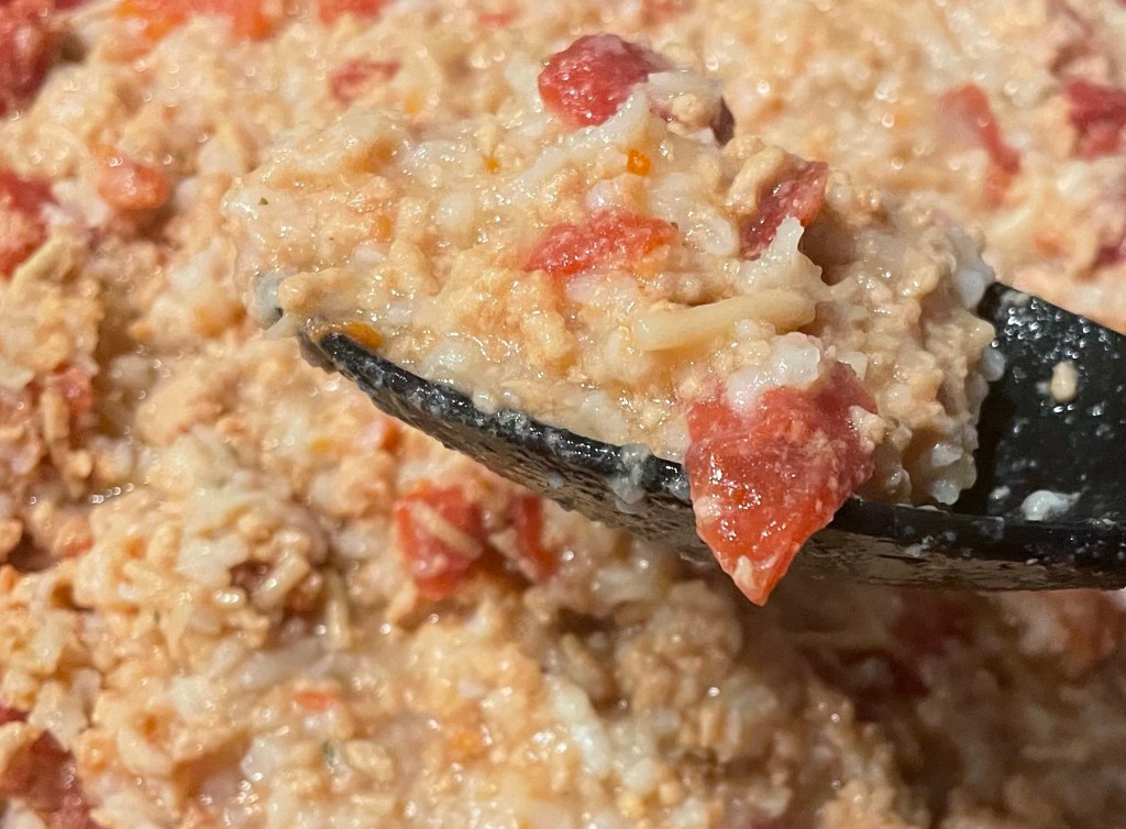 - Fill the tomato can with water, once full & pour in, then half & pour in. The rice needs the water to cook.