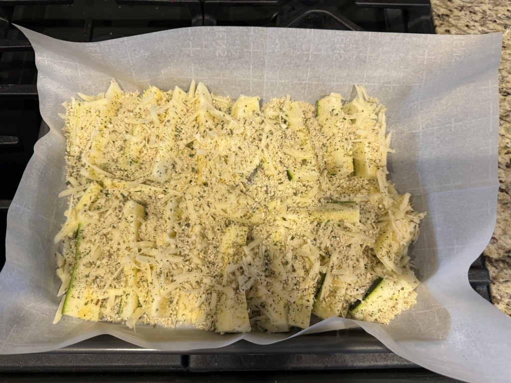 - Toddler: sprinkle the Parmesan on top of the zucchini as evenly as possible.